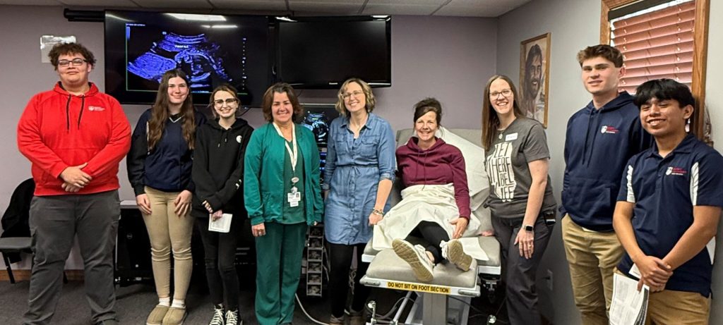 Photo Caption: Some of the participants in the “Window to the Womb” project included (left to right) Connor Frauli; Laura Kuhns; Jacey Garza; Maureen Habing, HSHS St. Anthony’s Memorial Hospital ultrasonographer; Jill Pankau, registered diagnostic medical sonographer; Renee James, volunteer mom; and her 24-week preborn baby on the ultrasound screen; Allison Deters, Family Life Center Nurse Manager; Henry Brent; and Elvin Martinez-Flores.