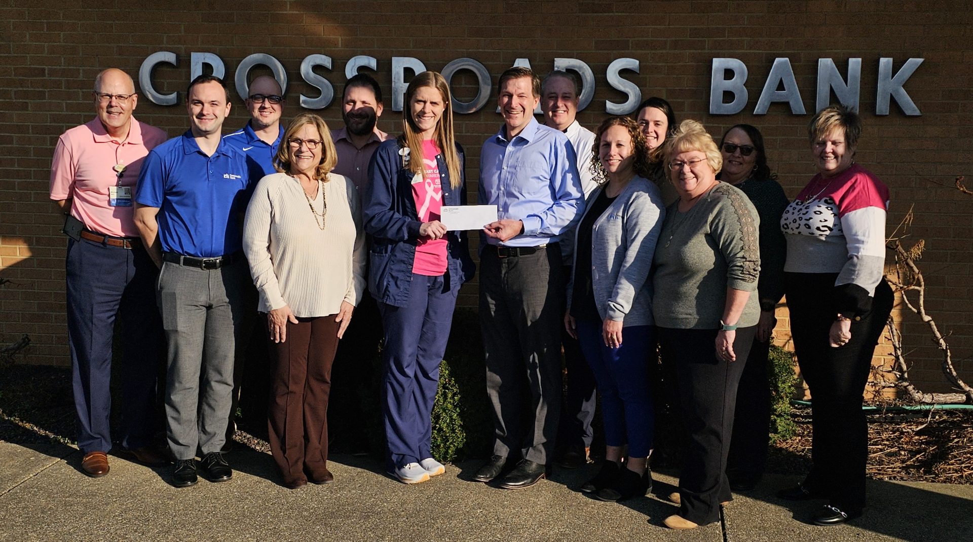 Crossroads Bank participating in the “Real Men Wear Pink” campaign and raised $300 by allowing their employees to wear jeans on Jean Days in October for a contribution and then making an additional donation. Eric Zeller, President and CEO, said, “Crossroads Bank and our employees are pleased to support HSHS St. Anthony Memorial Hospital in its mission of providing high-quality health care for all and enhancing the well-being of our community.” Pictured at the check presentation are bank and hospital representatives (left to right, front row): Hutson Coventry; Becky McGee; Ashley Davis, Women’s Wellness Nurse; Eric Zeller; Ashley Golden; and Lisa Warfel; (back row): Michael Wall, Philanthropy Manager; Torrey Wolf; Kory Doty; Rodney Murbarger; Bridgette Skees; Janet Lorton; and Amy Kingery.