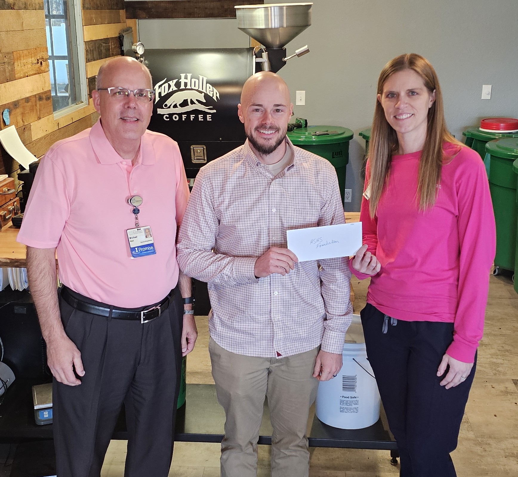 As part of Fox Holler Coffee’s “Heart of the Holler” program, Fox Holler Coffee raised $500 for the Women’s Wellness Center by donating a portion of all bagged coffee sales during the month of October purchased from either of the Fox Holler Coffee drive-thru locations. Left to right at recent check presentation are Michael Wall, Philanthropy Manager; Seth Wilson, Fox Holler Co-Owner; and Ashley Davis, Women’s Wellness Nurse.
