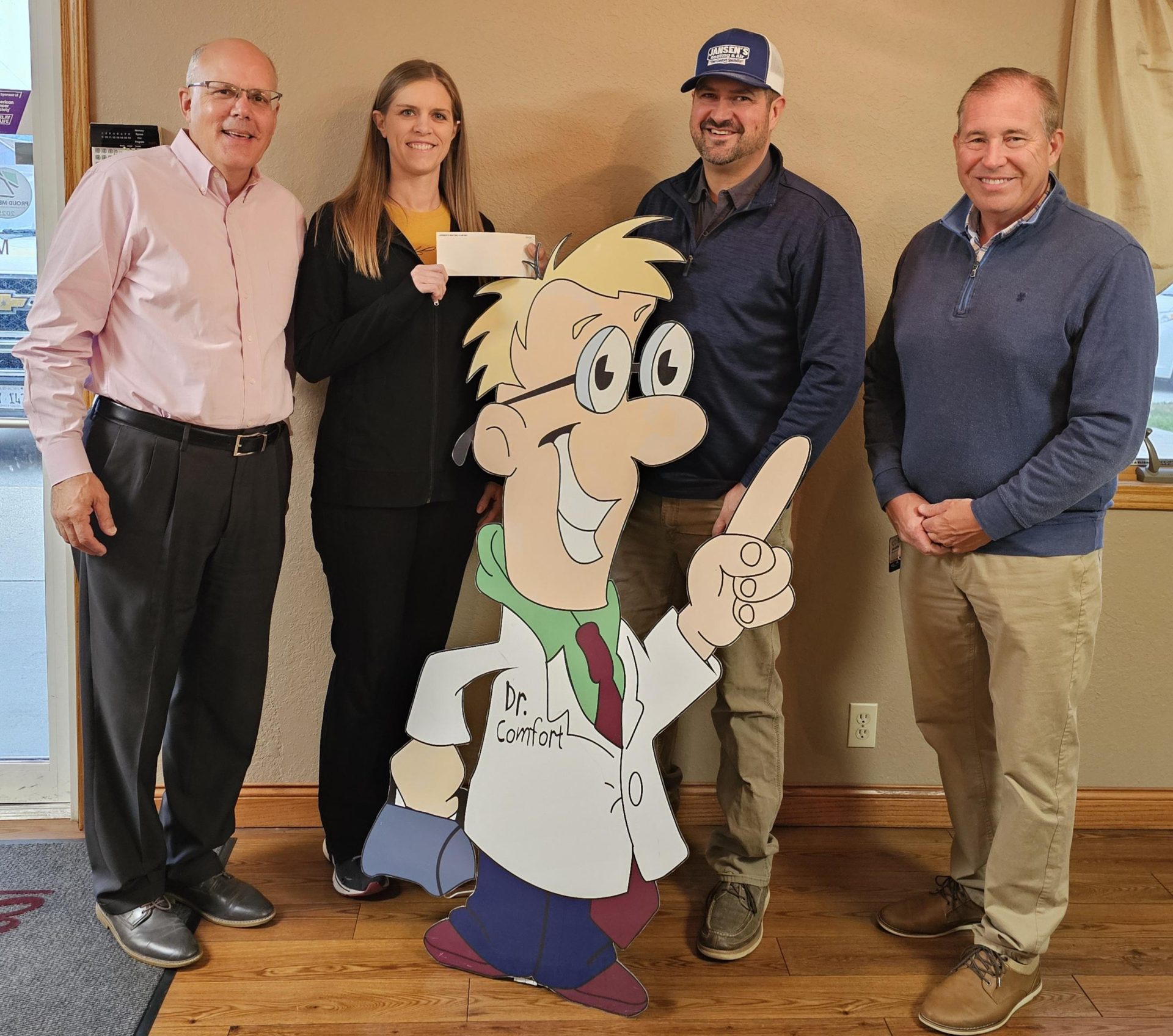 Jansen’s Heating and Air and Pizza Man raised funds through a combined effort in October. Pizza Man contributed $600 to the “Real Men Wear Pink” campaign by donating $1 for every large pizza sold on Wednesdays in October through Pizza Man’s “Pizza for a Purpose” promotion. Jansen’s not only donated a portion of every October service call, indoor air quality product and new complete heating/AC system installation but also matched Pizza Man’s donation dollar-for-dollar for a total donation of $5,005. Shown are (left and second from left in photos) Michael Wall, Philanthropy Manager; Ashley Davis, Women’s Wellness Nurse; and (far right in photos) Anthony Powers, Chief Administrative Officer, joined by (second from right in left photo) Greg Addis, Pizza Man Owner, and (second from right in right photo) Troy Jansen, Jansen’s Heating & Air Owner and General Manager, at recent check presentations.