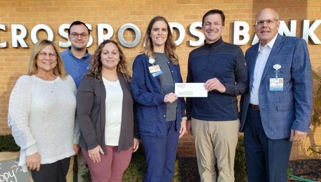 Photo Caption: Crossroads Bank raised $500 by allowing their employees to wear jeans on Jean Days in October for a contribution, and then matching all funds raised up to $500. Shown left to right: Becky McGee, assistant vice president, Crossroads Bank; Hutson Coventry, compliance officer, Crossroads Bank; Ashley Golden, retail banking manager, Crossroads Bank; Ashley Davis, St. Anthony’s Women’s Wellness nurse navigator; Eric Zeller, president and CEO, Crossroads Bank; and Michael Wall, St. Anthony’s director of philanthropy.