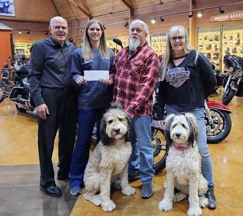 Photo Caption: Legacy Harley-Davidson raised $370 for the breast cancer month campaign through two events held in October. One event included a “Harley’s for Hope” motorcycle ride to Iuka, Illinois and the second was their “In the Pink” event with activities such as a bake sale, candy bar, updos by El Beauty, and massages by A Touch of Marigold. Shown left to right: Michael Wall, St. Anthony’s director of philanthropy; Ashley Davis, St. Anthony’s Women’s Wellness nurse navigator; and Paul Gutman and Noni Hamlin, partners in Legacy Harley-Davidson (with Luci and Lexi).