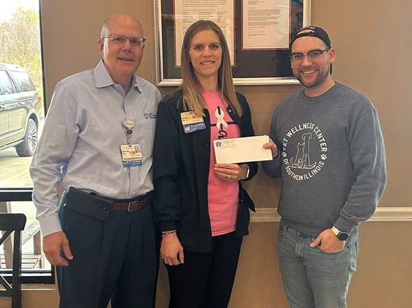 Photo Caption: Pet Wellness Center of Southern Illinois donated $500 to the Real Men Wear Pink campaign by donating a portion of all their spay surgeries in October, and then Pet Wellness Center matched all funds raised. Shown left to right: Michael Wall, St. Anthony’s director of philanthropy; Ashley Davis, St. Anthony’s Women’s Wellness nurse navigator, and Gage Houser, practice manager at Pet Wellness Center.
