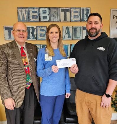 Photo Caption: Webster Tire and Auto Service raised funds for breast cancer patients by donating $5 from each oil change done during the month of October. From their 238 oil changes, they donated $1,190 to the Women’s Wellness Center. Shown left to right: Michael Wall, St. Anthony’s director of philanthropy; Ashley Davis, St. Anthony’s Women’s Wellness nurse navigator; and Tyler Shoemaker, Webster Tire and Auto service manager.