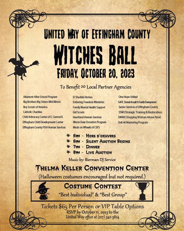 Effingham, Illinois ‐ The United Way of Effingham County has announced their annual event will be held on October 20, 2023. Join them at the Thelma Keller Convention Center for the 2023 Witches Ball to benefit 20 local partner agencies.