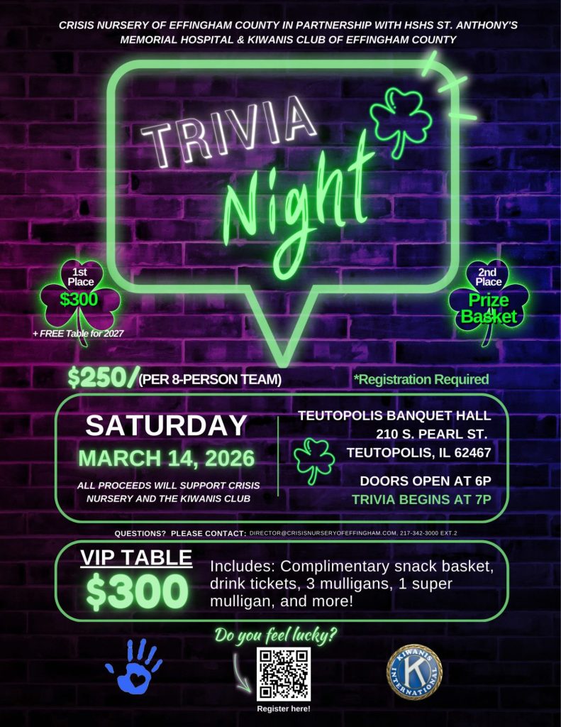 Crisis Nursery of Effingham County and the Kiwanis Club of Effingham County are teaming up for Trivia Night 2026, a night full of fun, laughs, and friendly competition and St. Patrick’s Day spirit!