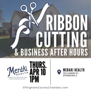 The Effingham County Chamber invites the community to celebrate the grand opening of Meraki Health’s new Effingham clinic with a special Business After Hours & Ribbon Cutting event. This pediatric & adult outpatient therapy office is now part of the Chamber and the local business community, and attendees are encouraged to join in the celebration.