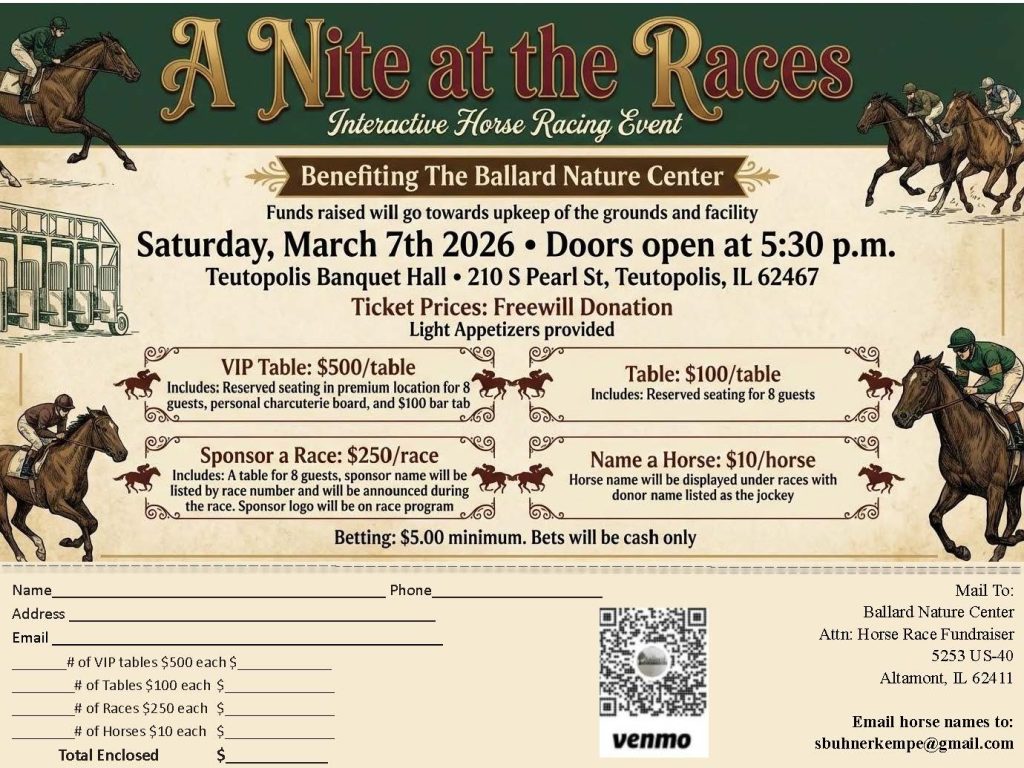 Join Ballard Nature Center for a fun and interactive evening of horse racing on Saturday, March 7, 2026 at Teutopolis Banquet Hall. Doors open at 5:30 p.m.