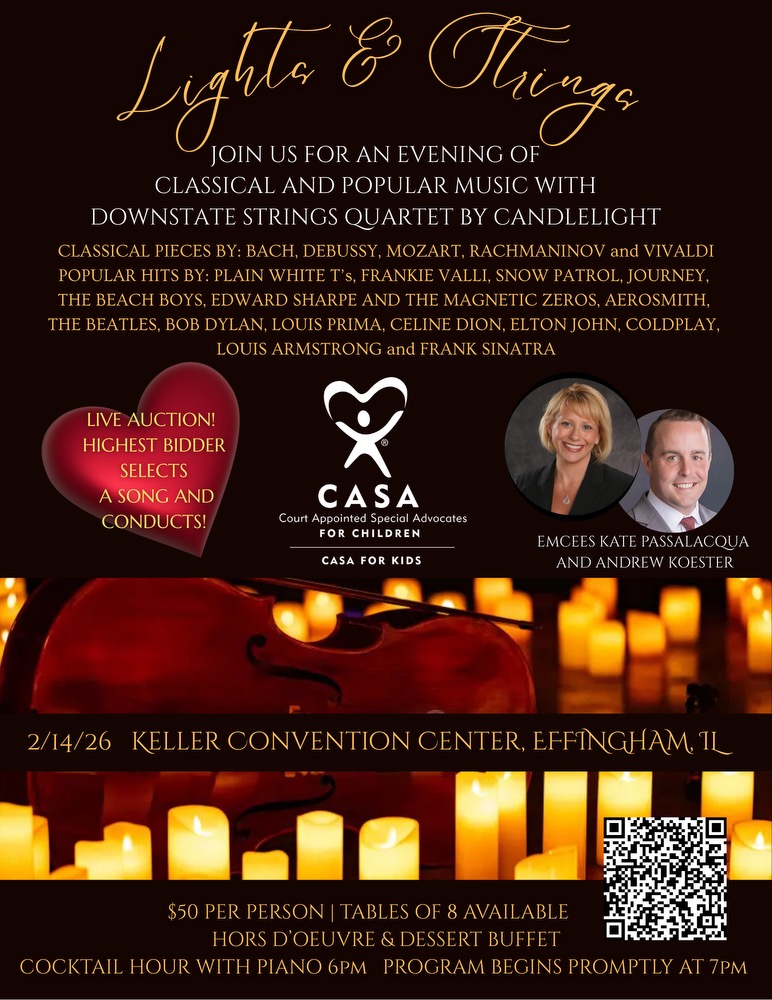 Lights & Strings is an elegant Valentine’s Day evening benefiting CASA for Kids, featuring the Downstate Strings Quartet performing by candlelight.