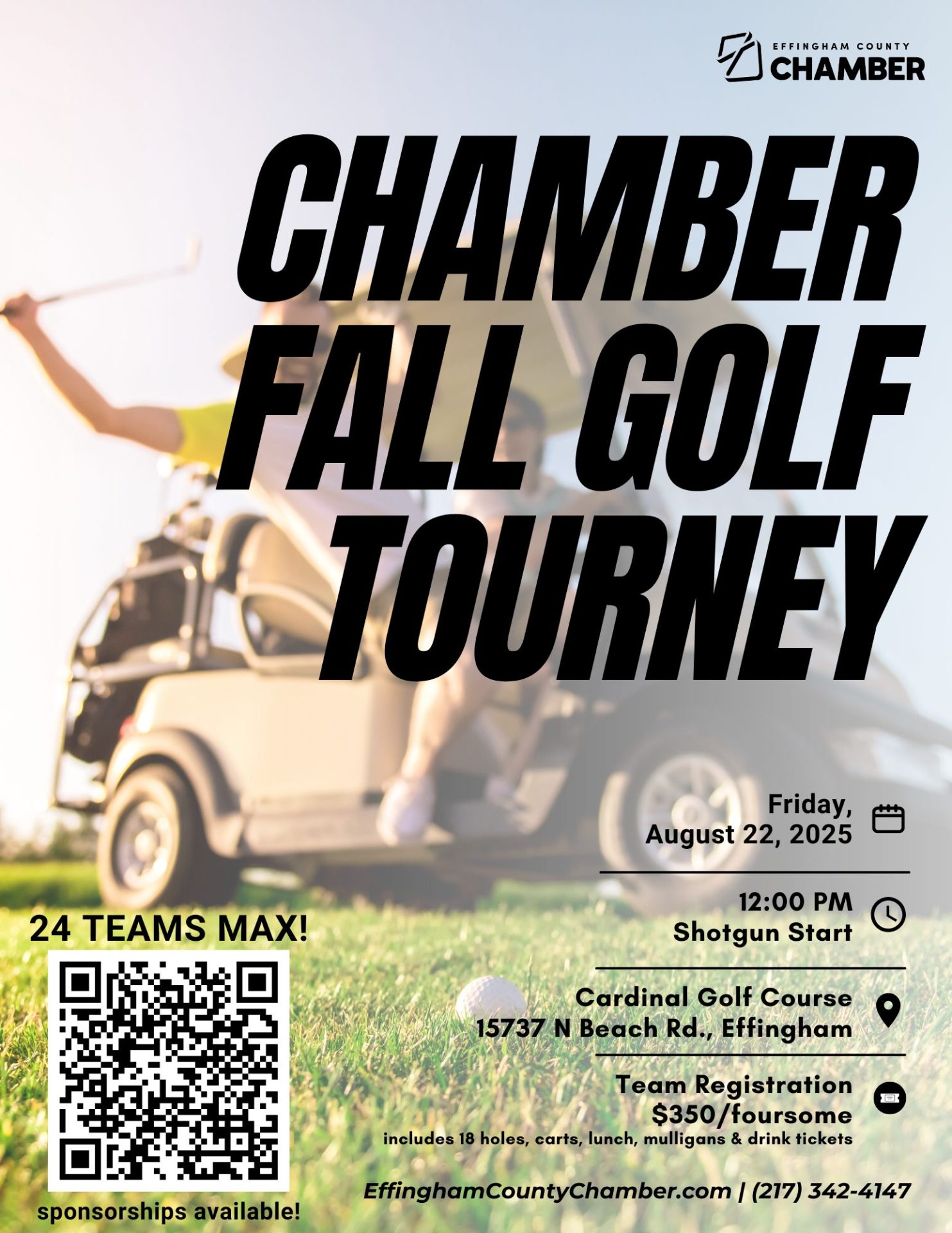 Welcome to the Chamber’s Fall Golf Outing! We’re looking forward to seeing you Friday, August 22, at Cardinal Golf Course for a fun afternoon of golf, networking, and friendly competition. The outing begins with a noon shotgun start, and with only 24 team spots available, it’s sure to be a great day on the course.