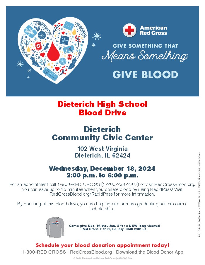 Dieterich High School will be hosting an American Red Cross blood drive. Come donate and help with the blood shortage!