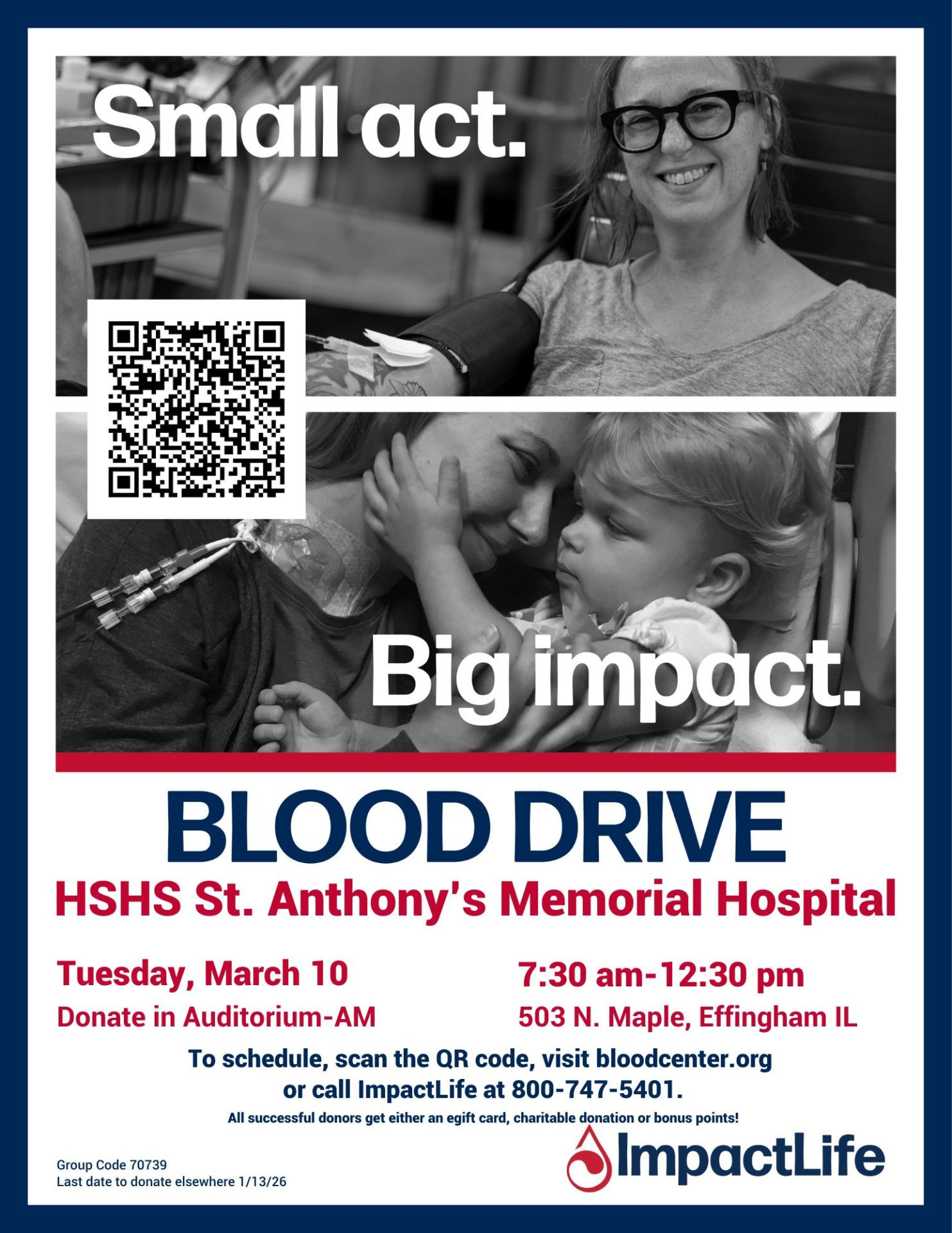 Appointments: To donate, please contact ImpactLife at (800) 747-5401 or visit www.bloodcenter.org and use code 70739 to locate the drive.