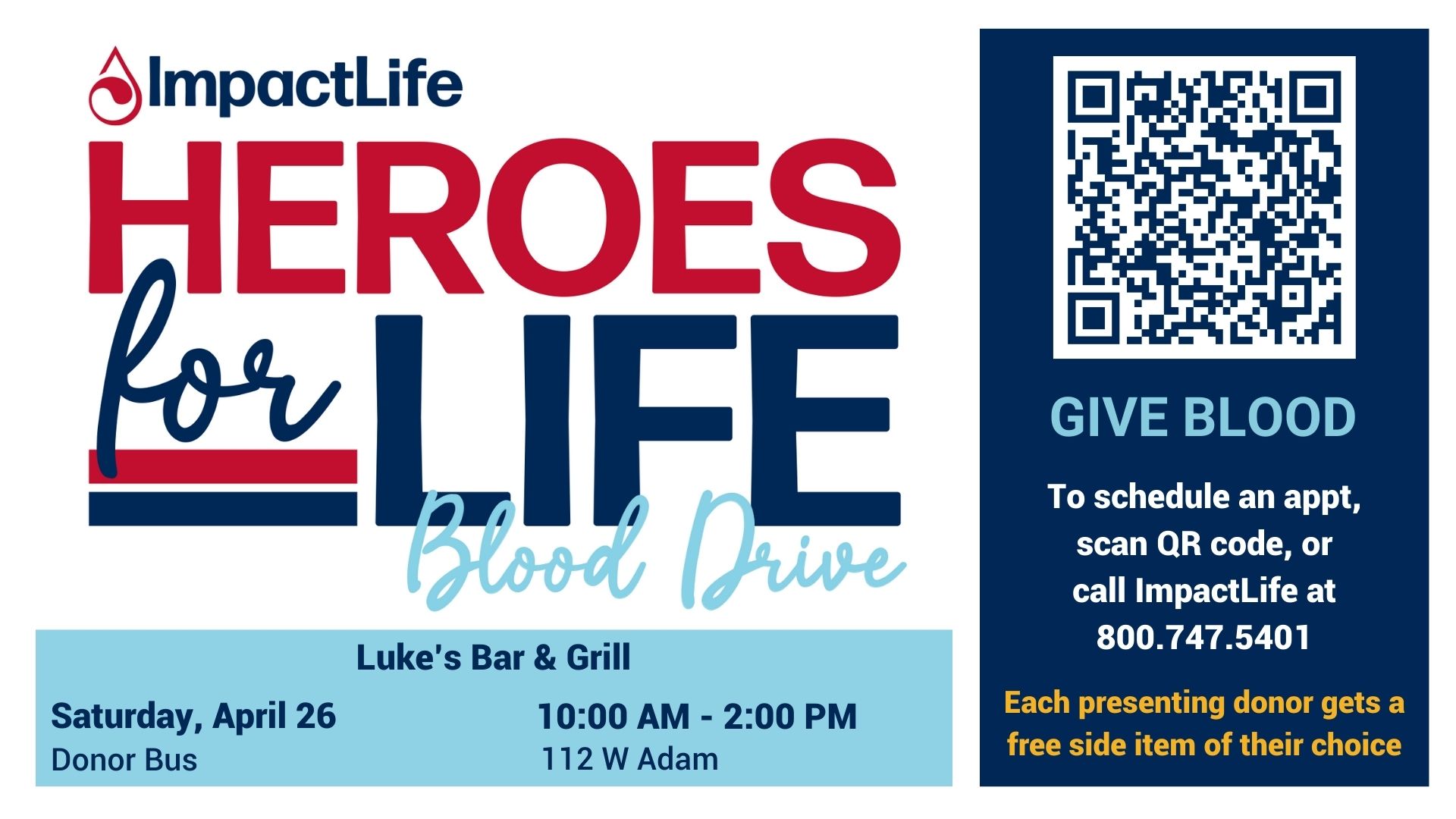 Luke’s Bar & Grill will host a community blood drive with ImpactLife, the provider of blood components for local hospitals. The blood drive will be on Saturday, April 26 from 10a to 2p at 112 W Adam, inside the Donor Bus