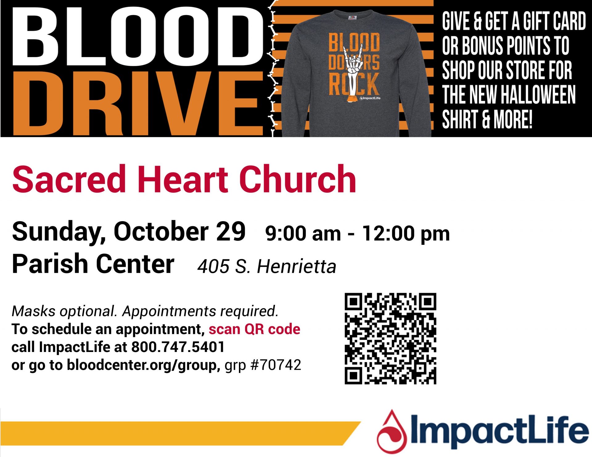 Sacred Heart Church will host a Community Blood Drive with ImpactLife, the provider of blood components for local hospitals. The blood drive will be from 9:00 am to 1:00 pm on Sunday, March 23 at 405 S. Henrietta, inside Parish Center
