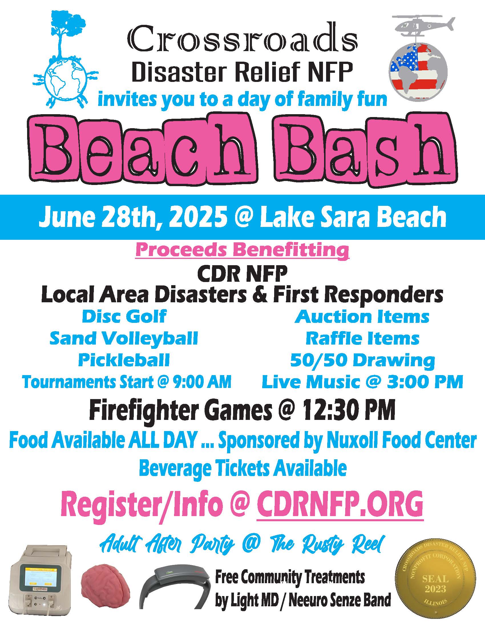 The Beach Bash will also feature raffles, a 50/50 drawing, and auction items, with all proceeds supporting local area disaster relief efforts and first responders through CDR NFP. Free community treatments will be offered courtesy of Light MD and the Neeuro Senze Band. And don’t forget—the fun continues at The Rusty Reel for the Adult After Party.