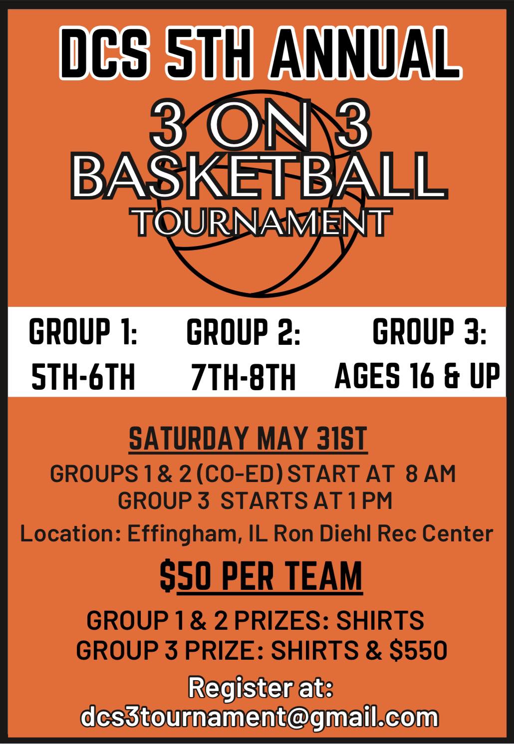Join the excitement at the DCS 5th Annual 3-on-3 Basketball Tournament on Saturday, May 31st at the Ron Diehl Rec Center in Effingham, IL!