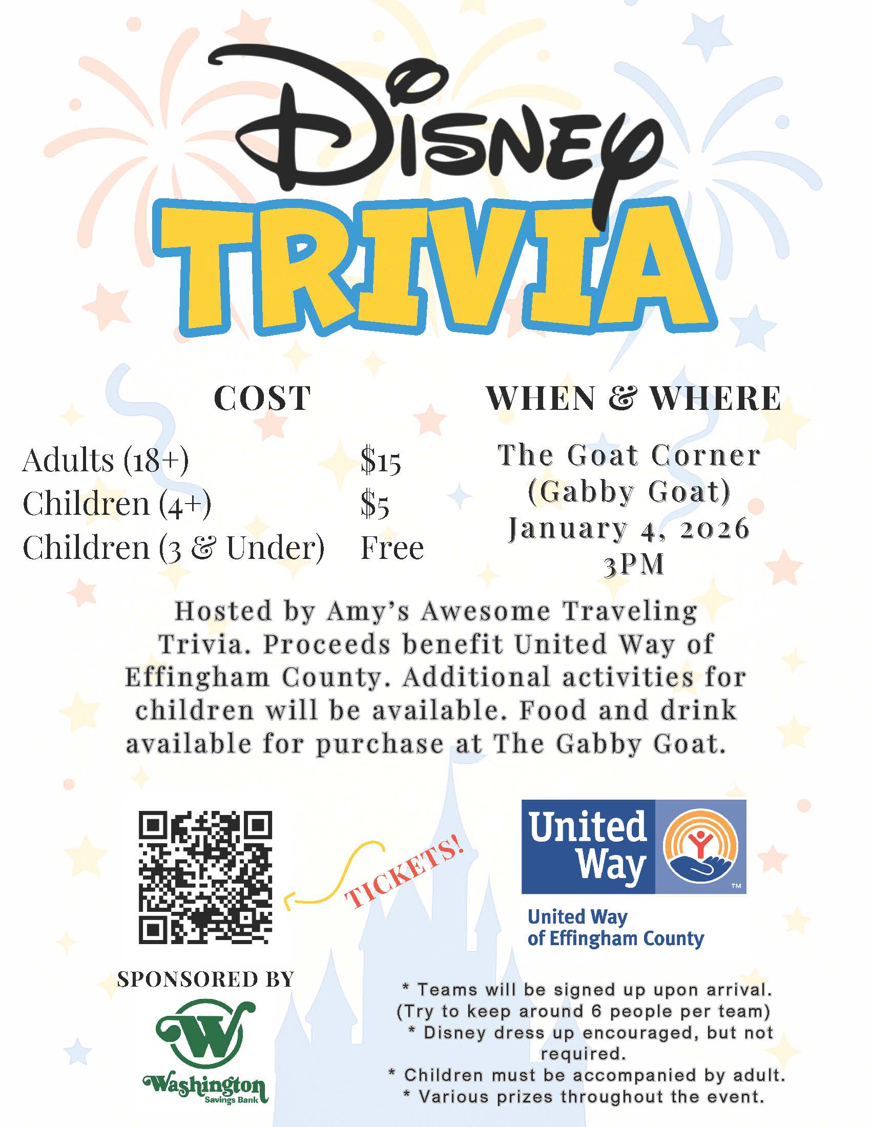 Join United Way of Effingham County on January 4 at The Goat Corner inside The Gabby Goat for Disney Trivia!