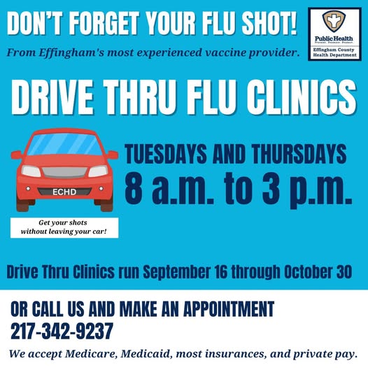 The Effingham County Health Department (ECHD) will once again be offering Flu Vaccination Clinics at its 901 W. Virginia location. We all know how miserable the flu can be, and for some the flu may lead to hospitalization. A flu shot can help reduce the severity of the illness, making it important that you get an annual flu shot.
