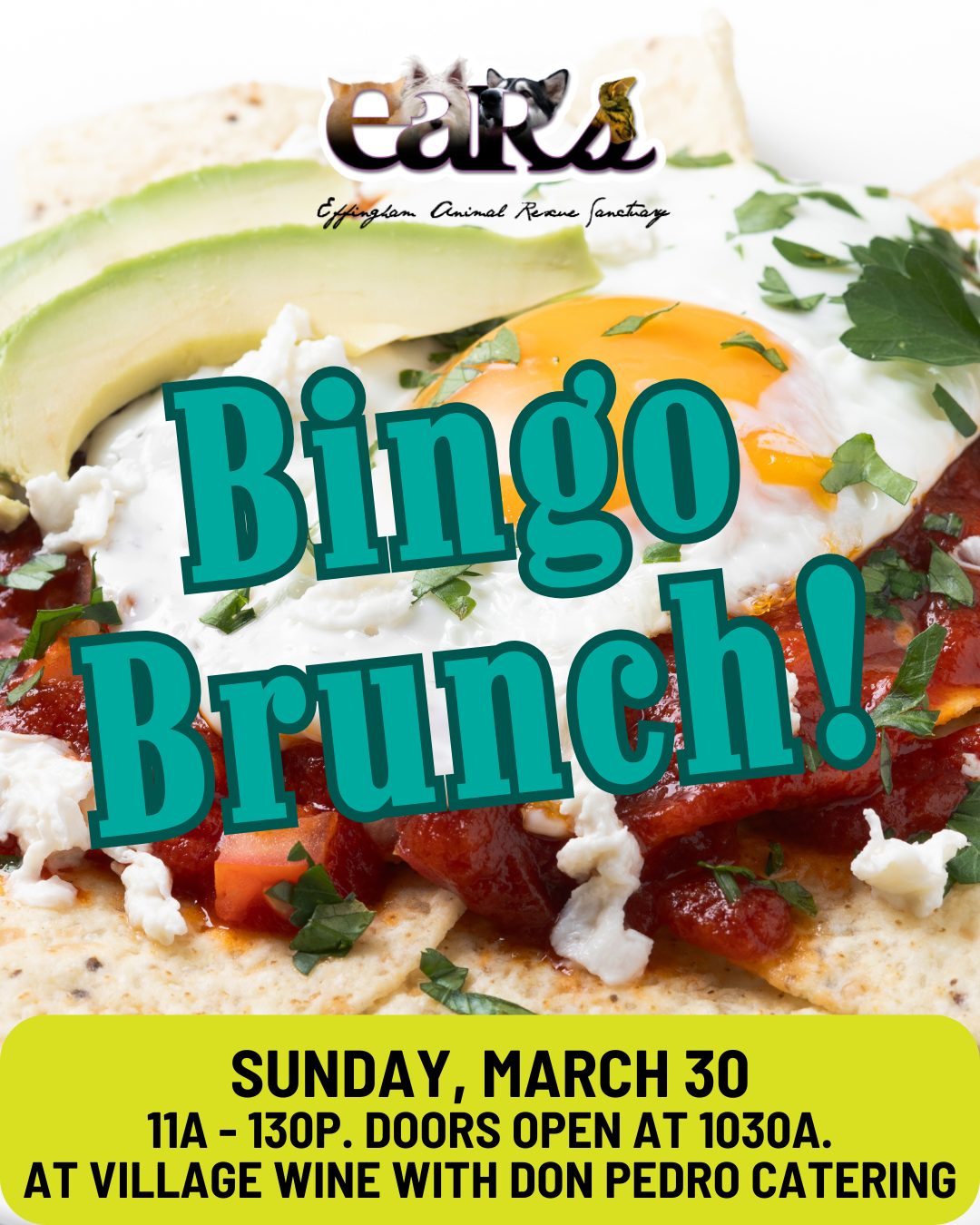 Includes brunch buffet catered by Don Pedro’s, Two Drink Tickets for either Don Pedro Margaritas or Village Wine’s EARS Specialty Cocktail, and 10 games of BINGO with fun prizes!!