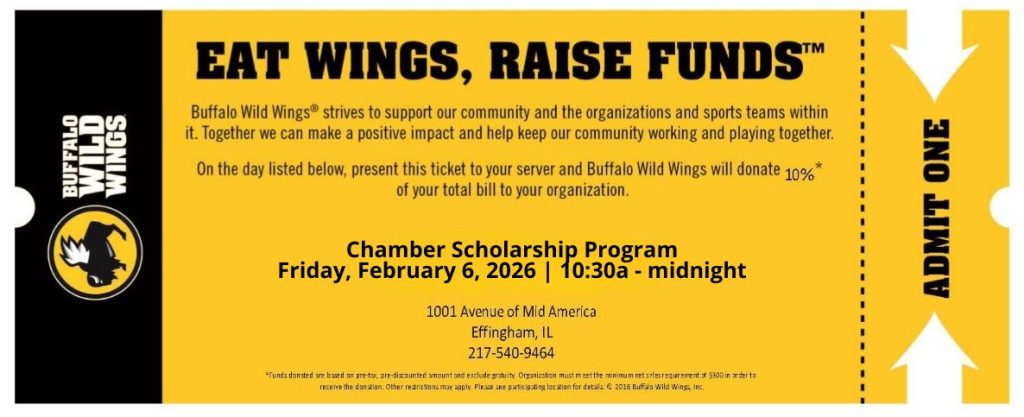 Join us at Buffalo Wild Wings Effingham for a delicious way to support local students! On Friday, February 6, enjoy lunch, dinner, or anything in between, and a portion of eligible sales, including alcohol, will be donated to support the Effingham County Chamber Scholarship Program.