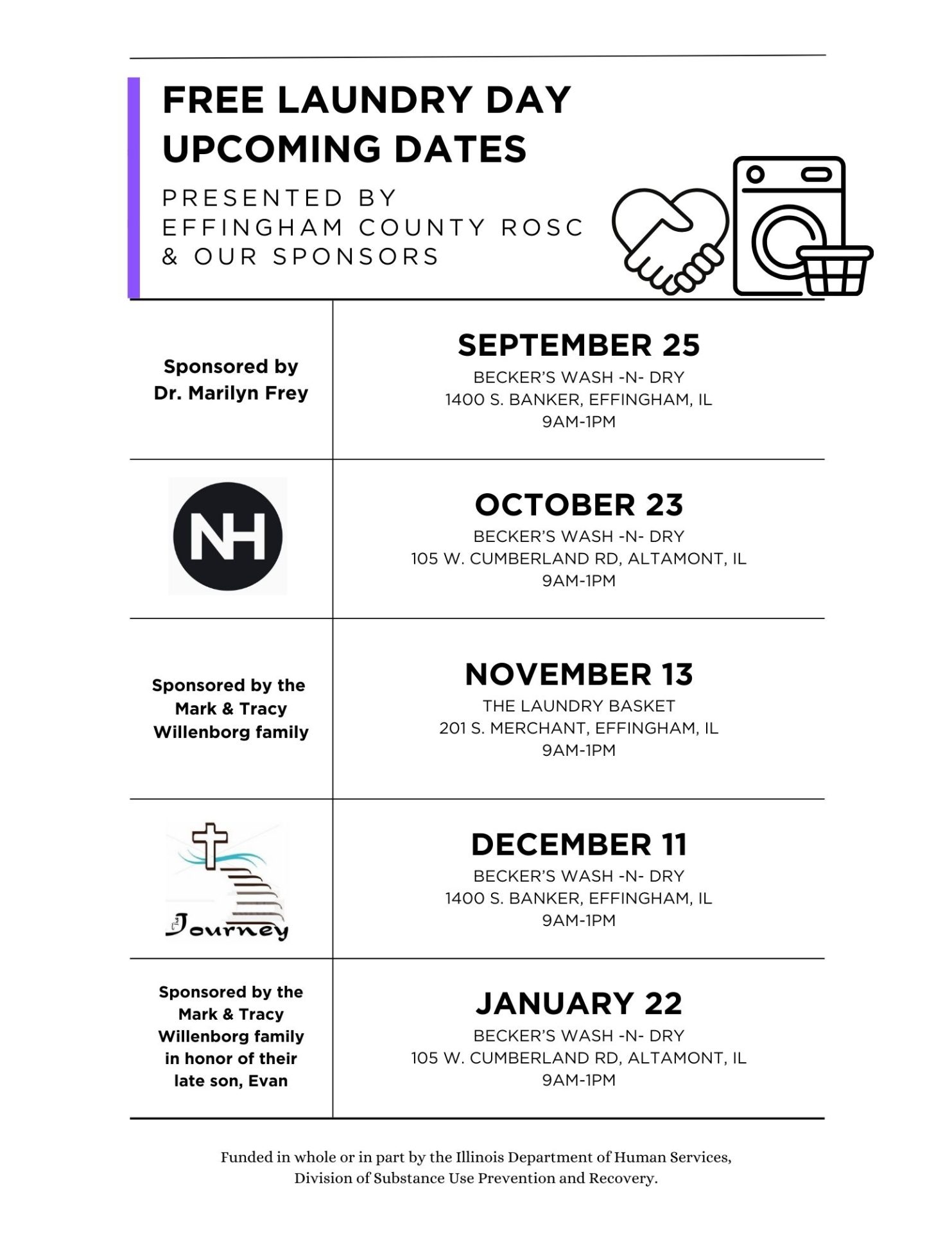 Effingham County ROSC & our 2024-2025 Sponsors are providing FREE Laundry Days for the community September ’24- January ’25!