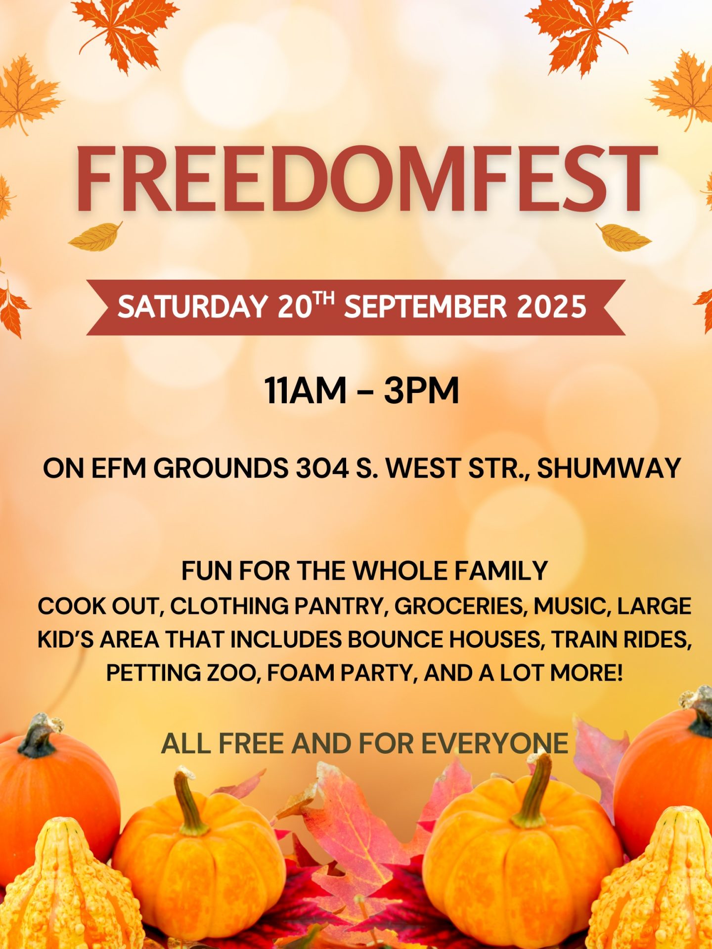 Enduring Freedom Ministries is located in the old Shumway Grade School close to the intersection of Illinois Route 33 and West Street in Shumway. EFM hosts a soup kitchen in their Five and Two restaurant and a food pantry.