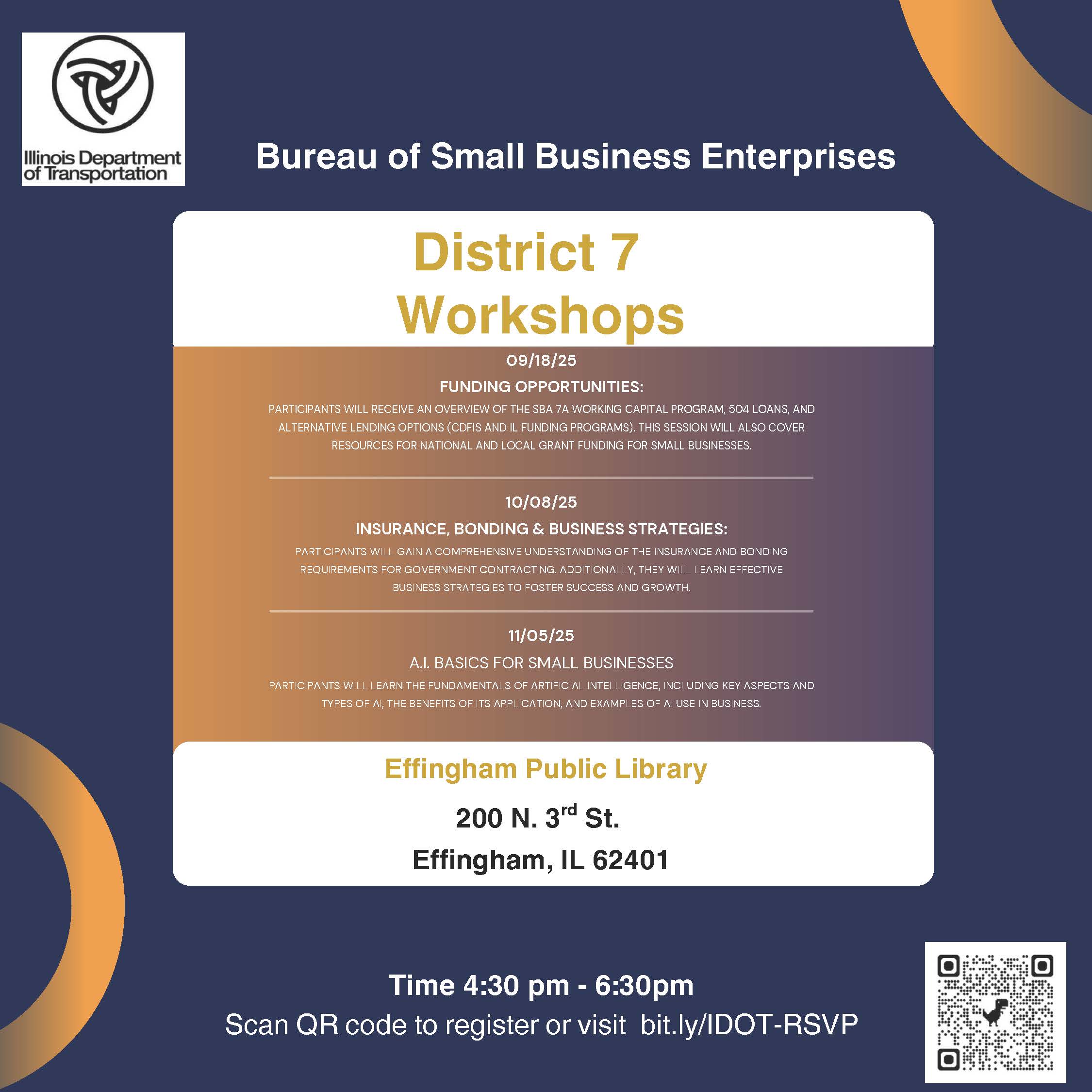 The Illinois Department of Transportation (IDOT) Bureau of Small Business Enterprise Supportive Services is hosting FREE workshops covering topics such as: