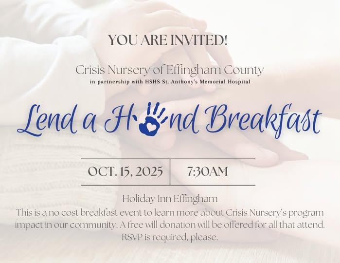 We invite you to join us Wednesday October 15, 2025 starting at 7:30 a.m. at the Holiday Inn Effingham for the Lend a Hand Breakfast for Crisis Nursery of Effingham County. We look forward to connecting over a no-cost breakfast and presenting our investment plan for Crisis Nursery of Effingham County. Our investors’ dollars have been hard at work. We are excited to showcase their effect and our plans for the future!