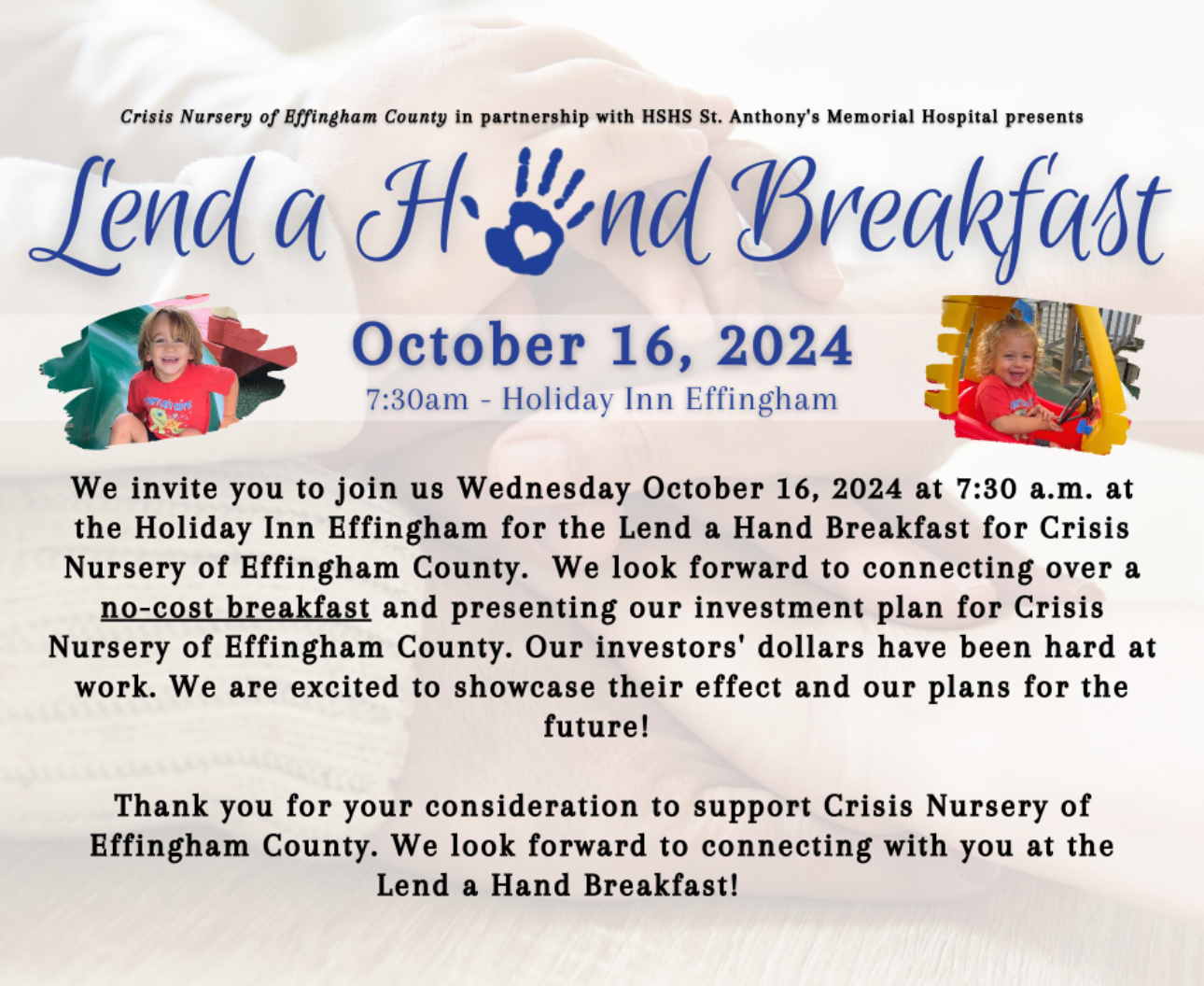 We invite you to join us Wednesday October 15, 2025 starting at 7:30 a.m. at the Holiday Inn Effingham for the Lend a Hand Breakfast for Crisis Nursery of Effingham County. We look forward to connecting over a no-cost breakfast and presenting our investment plan for Crisis Nursery of Effingham County. Our investors’ dollars have been hard at work. We are excited to showcase their effect and our plans for the future!