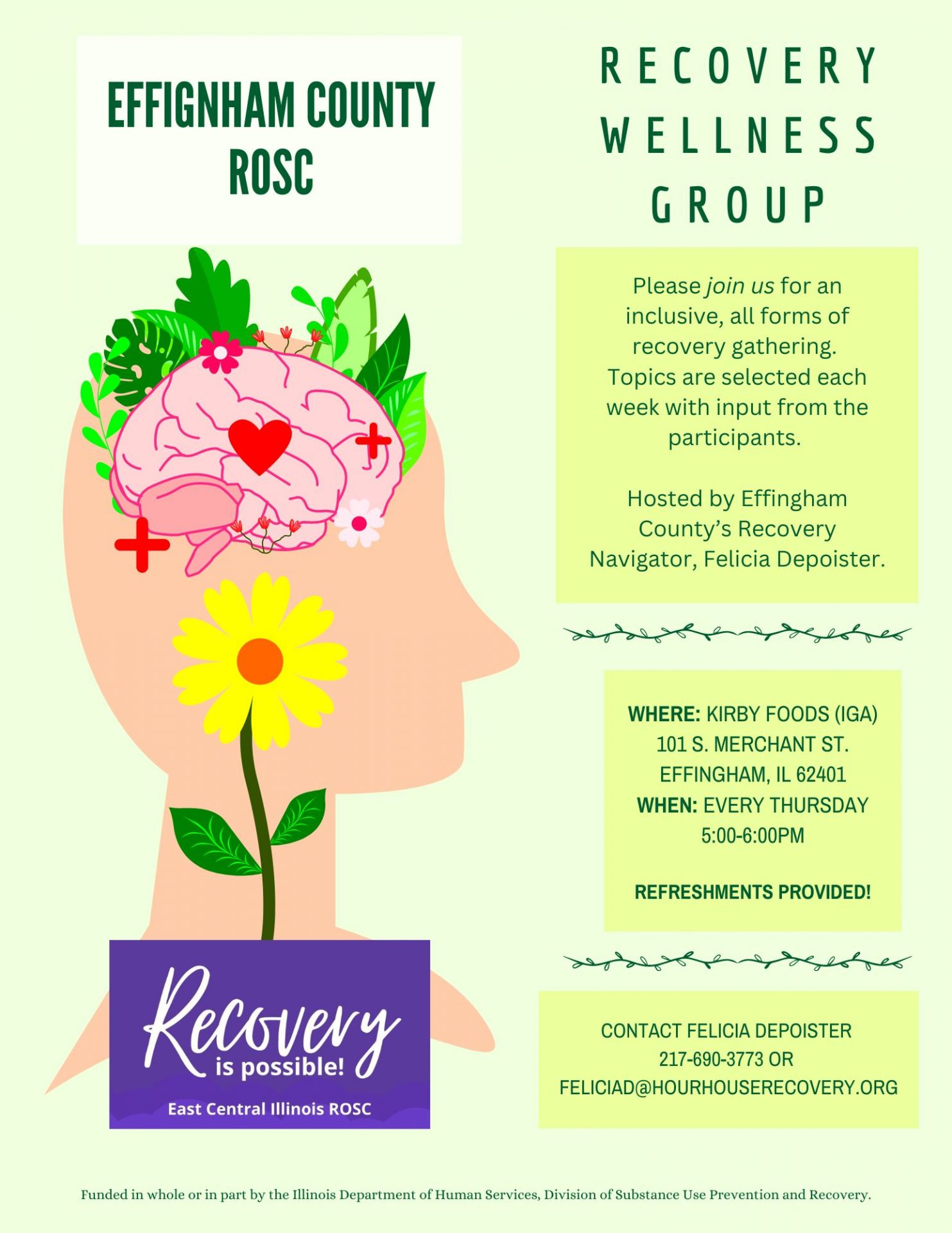 Effingham County ROSC provides a free Recovery Wellness group every Thursday at Kirby Foods (Ironhorse Cafe) hosted by ROSC’s Recovery Navigator, Felicia Depoister.
