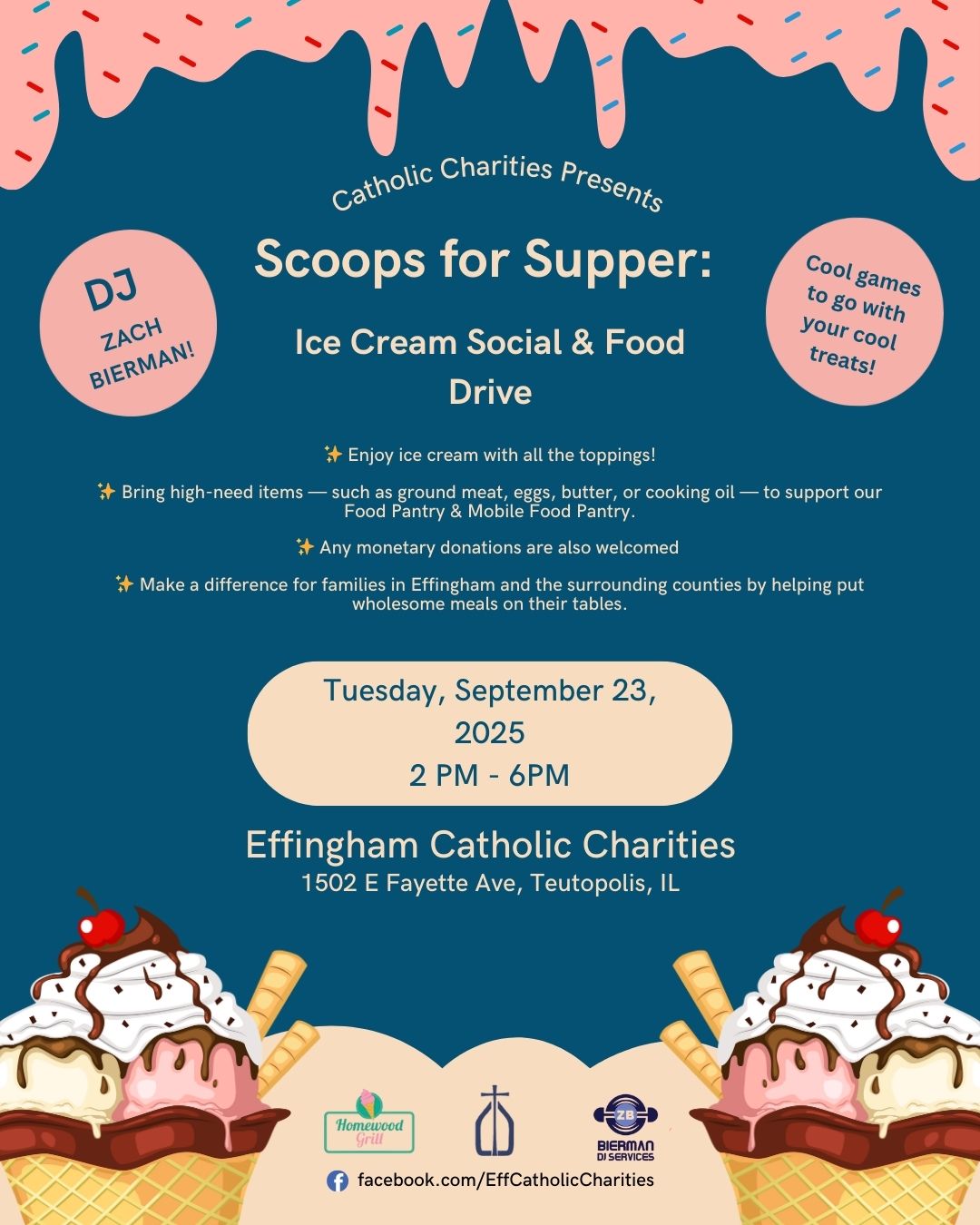 Come out and enjoy ice cream with all the toppings, courtesy of Homewood Grill Effingham, while dancing and hanging out to music from Bierman DJ Services. We’re also encouraging attendees to support local families by bringing high-need items such as ground meat, eggs, butter, cooking oil, or any non-perishables. Monetary donations of any amount are also greatly appreciated.
