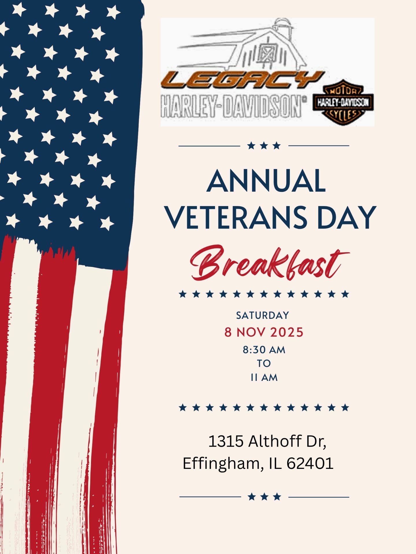 Legacy Harley Davidson’s Annual Veterans Day Breakfast on November 8th, 2025, serving our Service Men and Women pancakes, biscuits and gravy, bacon, sausage, along with coffee and juices.