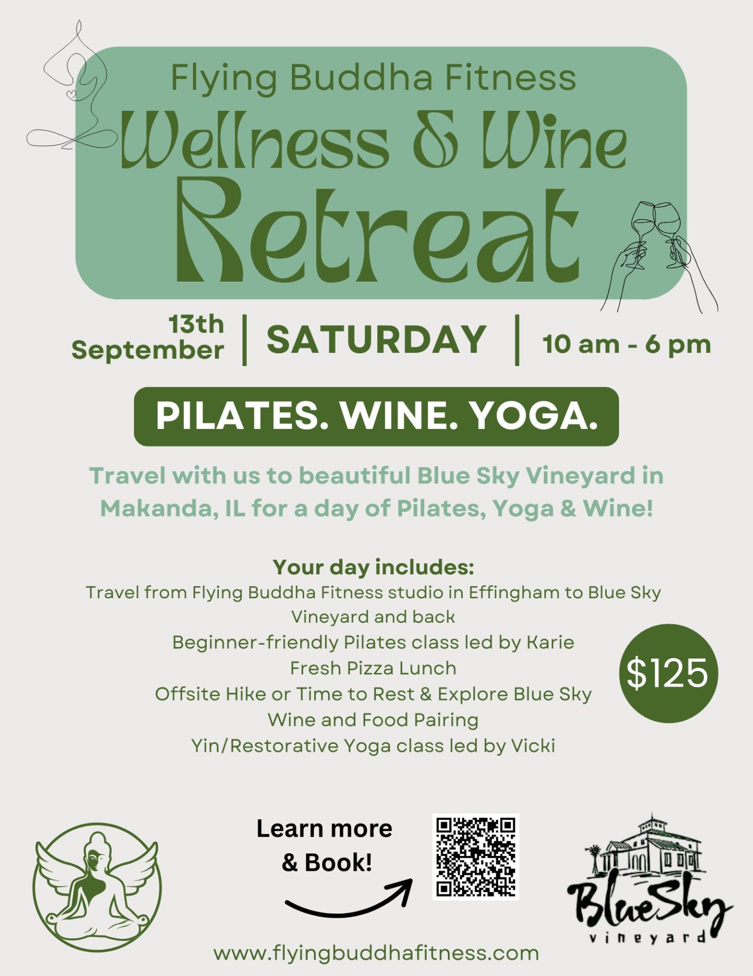 *Travel to and from Blue Sky Vineyard (leaving and returning to Flying Buddha Fitness studio in Effingham, IL)