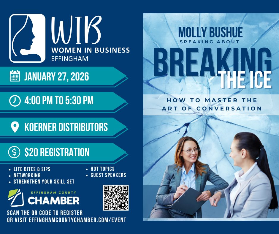 The Chamber’s Women in Business (WIB) committee invites you to an engaging event designed to connect, inspire, and strengthen professional relationships. This event features guest speaker Molly Bushue (Effingham County CEO Facilitator and Effingham County Christmas Store) and focuses on building confidence in conversation, networking with purpose, and breaking down barriers in both personal and professional settings.