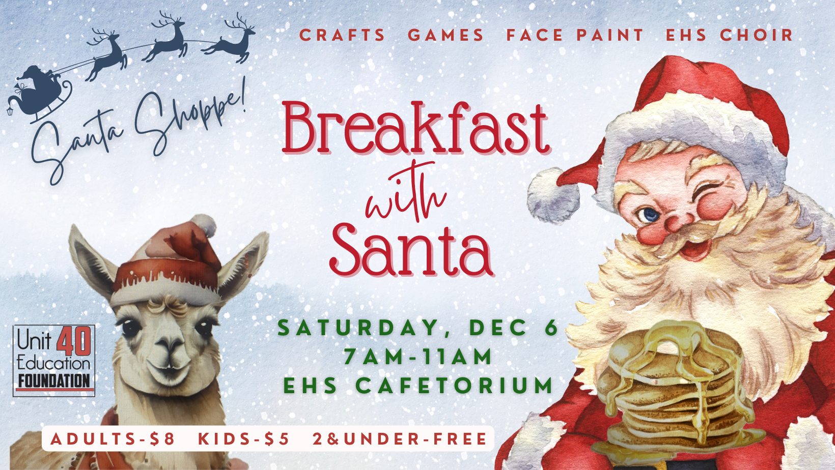 Celebrate the holiday season with the annual Breakfast with Santa hosted by the Unit 40 Education Foundation! Enjoy a delicious pancake breakfast served with a side of rope sausage, coffee, orange juice, or milk. Kids will love creating a specialty Snowman Pancake. There will be a Santa Shoppe for kids to purchase goodies. Enjoy taking