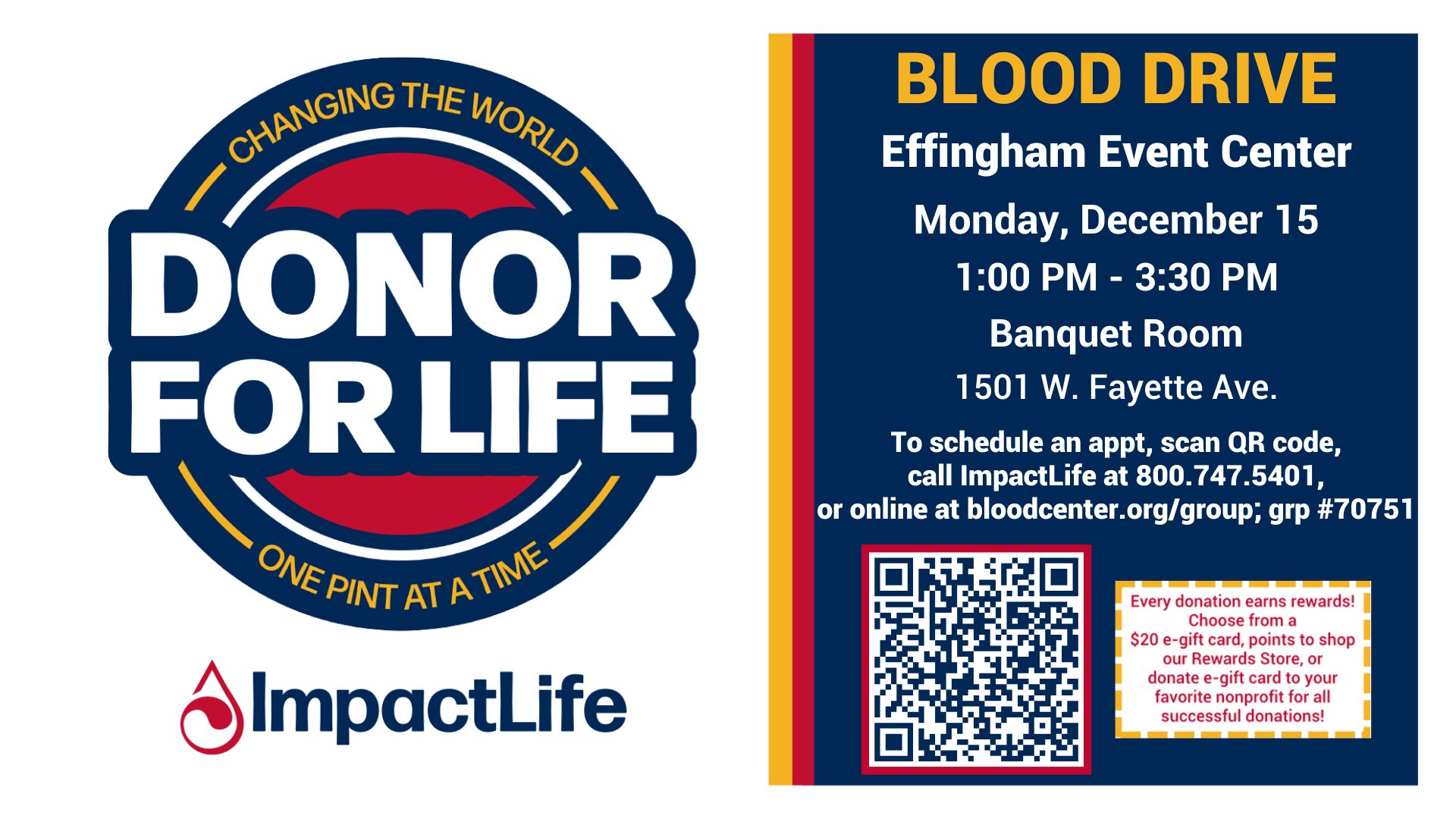 Effingham Event Center will host a community blood drive with ImpactLife, the provider of blood components for local hospitals. The blood drive will be from 1:00 pm to 3:30 pm on Monday, December 15 at 1501 W. Fayette Ave., inside Banquet Room. What: Effingham Event Center Community Blood Drive When: Monday, December 15 | 1-3p