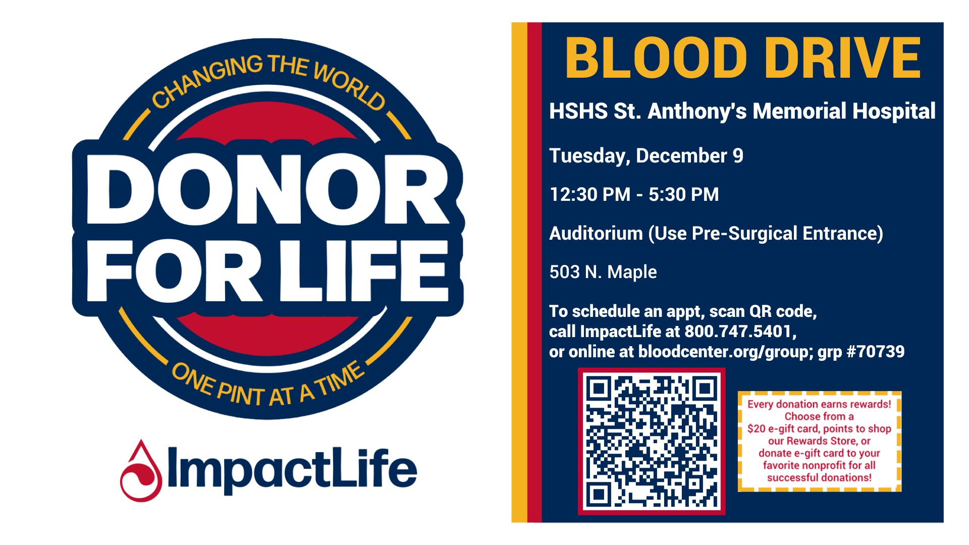 Effingham, IL -HSHS St. Anthony's Memorial Hospital will host a community blood drive with ImpactLife, the provider of blood components for local hospitals. The blood drive will be from 12:30 pm to 5:30 pm on Tuesday, December 9 at 503 N. Maple, inside Auditorium (Use Pre-Surgical Entrance). What: HSHS St. Anthony's Memorial Hospital Community Blood Drive