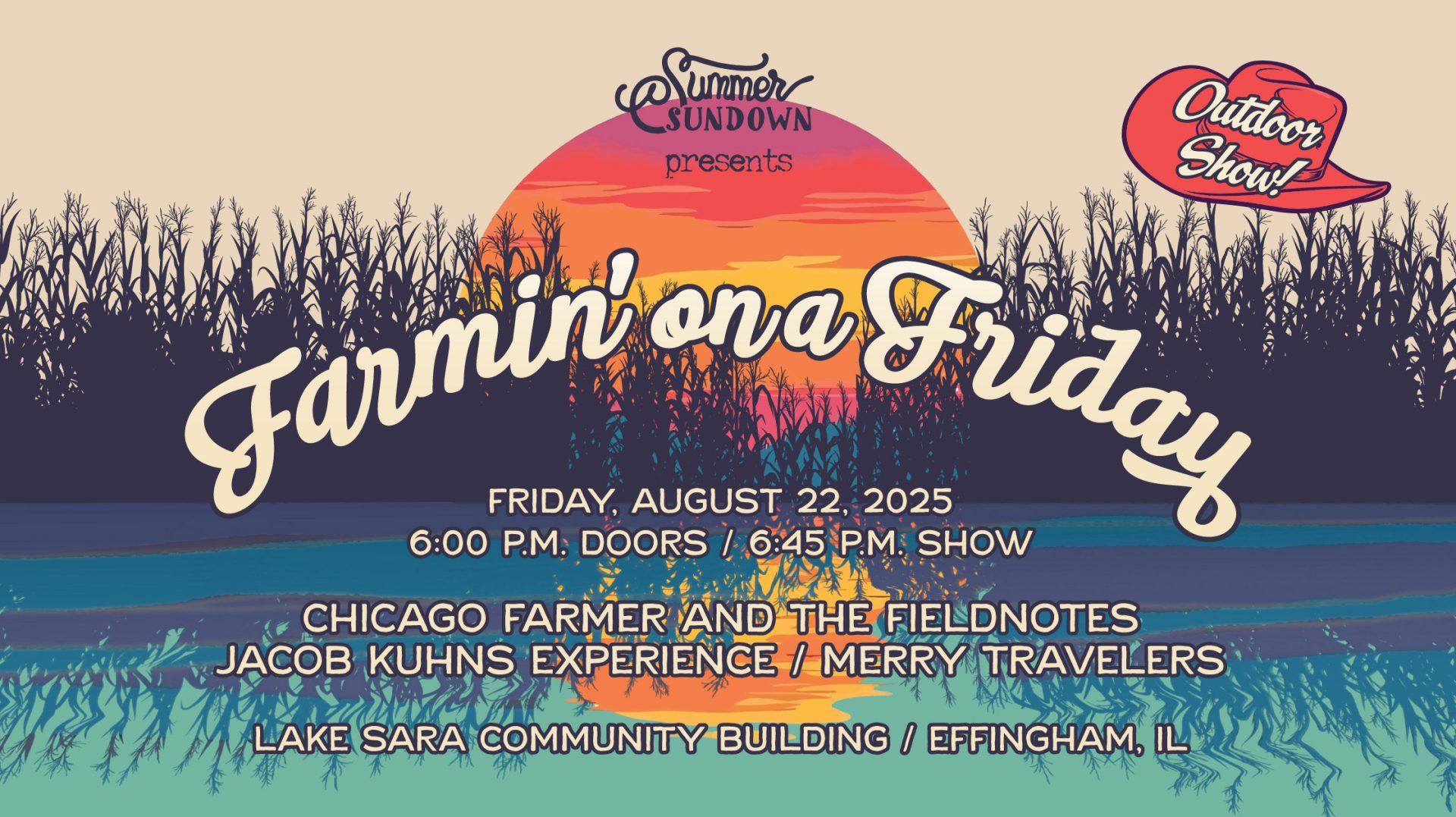 Lake Sara Community Building (by the dam) 9282 E Park Ave., EffinghamSummer Sundown presents: Farmin’ on a Friday w/ Chicago Farmer and the Fieldnotes, Jacob Kuhns Experience, Merry Travelers Friday Aug 22, 2025 - doors open at 6pm Outdoor Show Lake