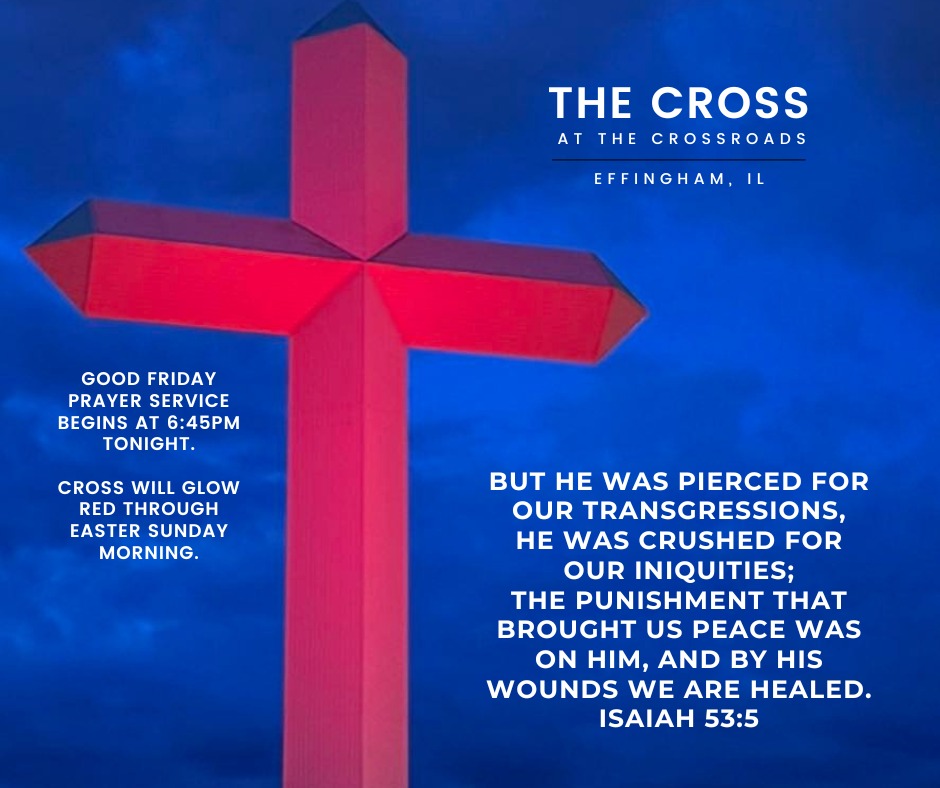 Good Friday prayer service on April 3 at 6:45pm with worship music, prayer, and message. Cross will be illuminated in red from Good Friday evening through Easter morning. Free gift