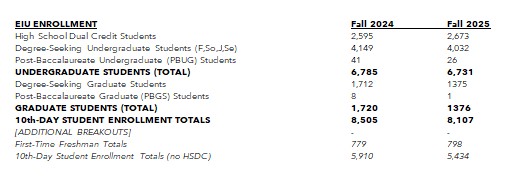 (Charleston, IL) – Eastern Illinois University’s Fall 2025 enrollment shows strong positive momentum across several key areas, according to the University’s official 10th-day enrollment reports. The numbers reflect steady growth in new students, academic program expansion, and continued sociocultural opportunities on campus, helping to offset a broader national trend of decreased international enrollment.