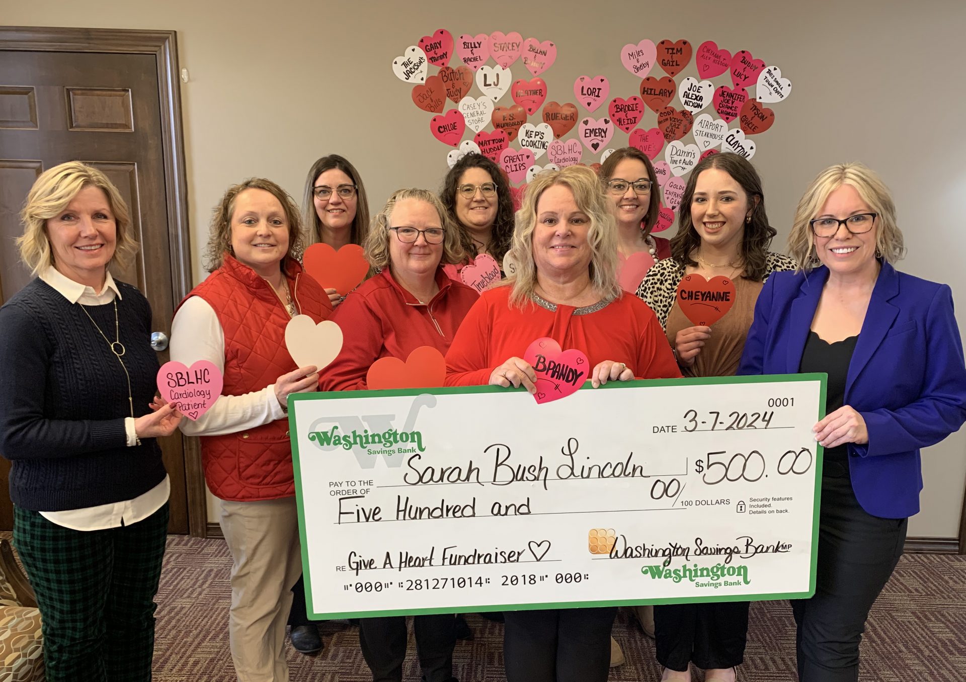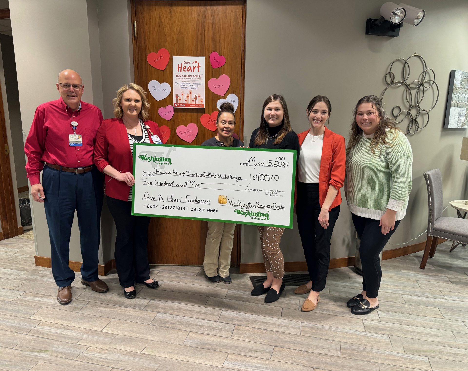 The month of February is always special at the Washington Savings Bank locations, as they host their annual “Give a Heart” fundraiser to raise Heart Health Awareness. All five locations participate in selling paper hearts for $1 apiece for this fundraiser. Customers then write or have an employee write their name, their company name, a family, a friend, or a pet’s name on the hearts in their honor.
