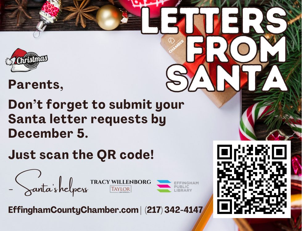 The Chamber Office and Santa’s Elves (Tracy Willenborg with Taylor Law and Effingham Public Library) are helping to ensure all children (young & old, naughty or nice) get their personalized letters from Jolly Ole’ St. Nicholas.